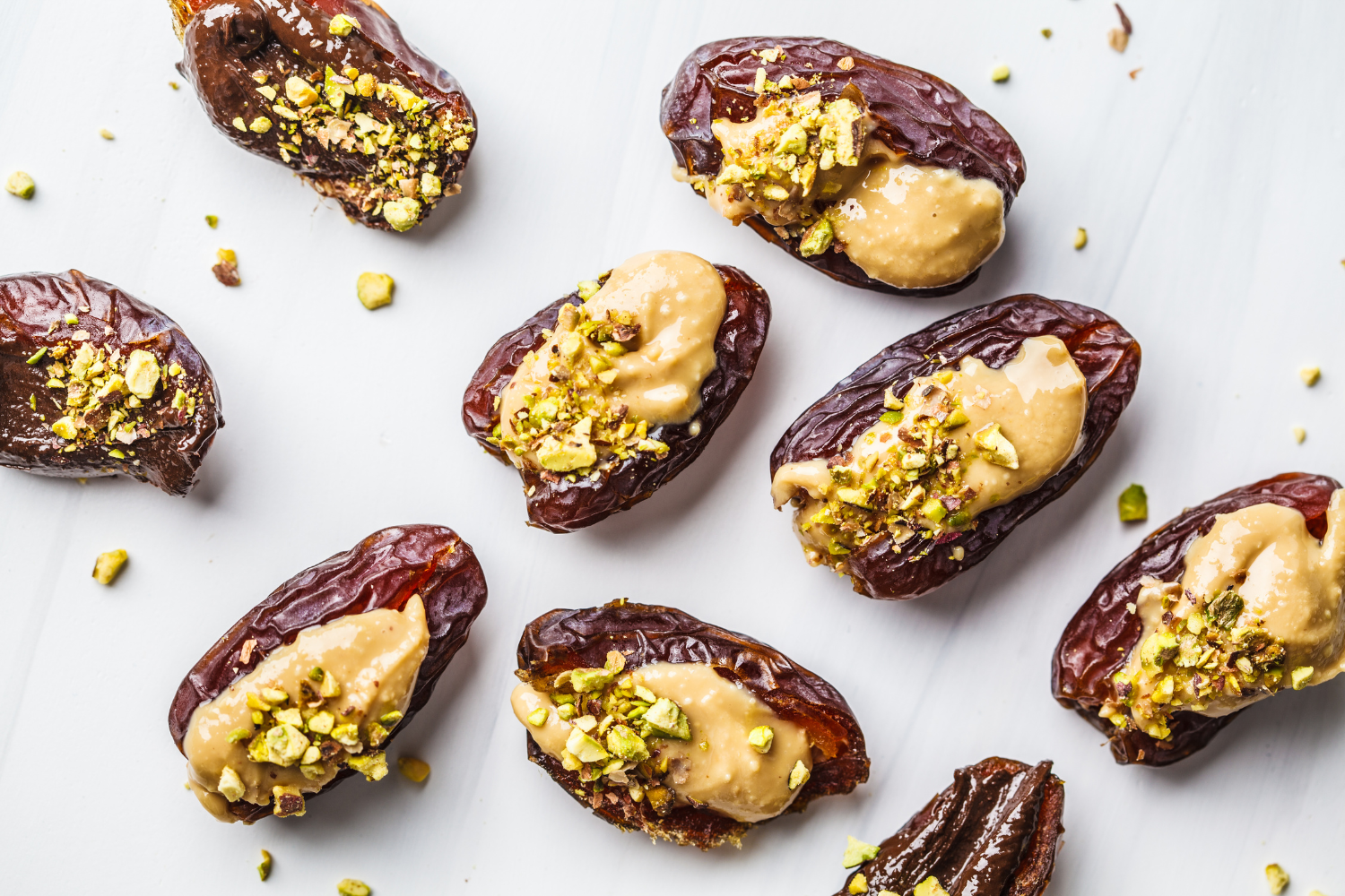 Snack 3: Dadels met 100% pindakaas en pistache